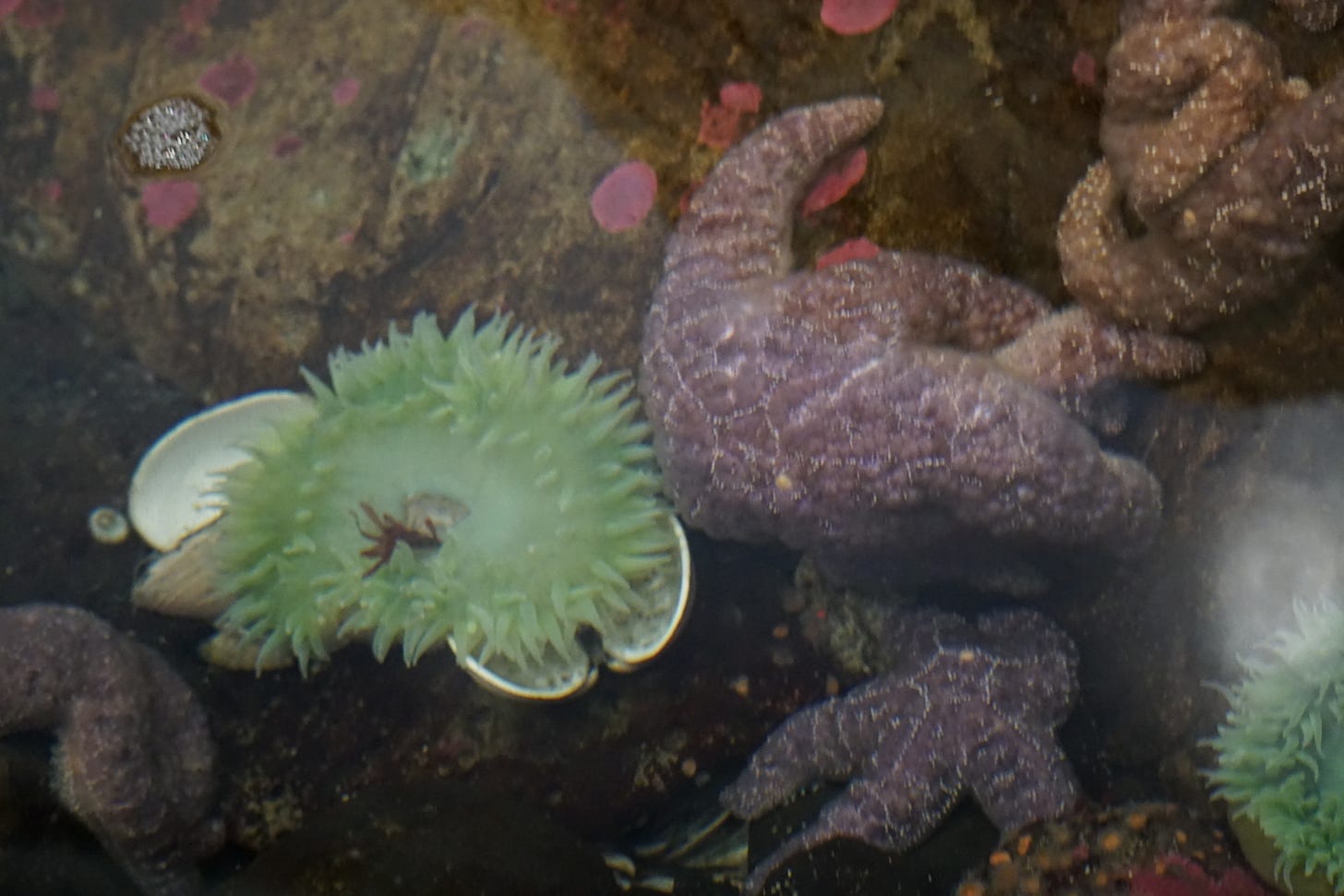 Over the past couple decades, visiting the ocean has been a bitter sweet experience. In my youth, my family made annual trips to Neah Bay, on the Makah Indian reservation, in far northwest Washington State. The tide pools enchanted me, filled with bright purple and orange sea stars (AKA starfish), green anemones, crabs, fishes, mussels, scallops, and more. I would walk the marina docks with no interest in the boats, but fascinated by the countless species of rockfish, anemone, starfish on and among the pilings and the sea birds and seals looking for a meal.